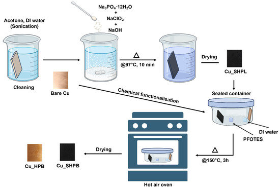 The schematic in Figure 1 illustrates the wetting states of the bare copper substrate and the modified superhydrophobic surface, showing the transition from complete wetting to the Cassie–Baxter regime. This visual guide highlights the role of hierarchical nanostructuring and chemical functionalization in achieving non-wetting behavior. Copper substrates were used for all experiments. The substrates were initially cleaned by sonication in a bath sonicator. To remove surface contaminants, the copper samples were sonicated in acetone for 10 min, followed sequentially by cleaning with ethanol and deionized (DI) water. To eliminate the native oxide layer, the cleaned copper surfaces were immersed in a 2 M HCl solution for 10 min, immediately rinsed with DI water, and gently wiped with tissue to minimize re-oxidation. To fabricate copper oxide nanostructures, an alkaline solution comprising NaClO2, NaOH, Na3PO4·12H2O, (Chemicals purchased from Sigma-Aldrich, Taufkirchen, Germany) and DI water (in weight ratios of 3.75:5:10:100, respectively) was prepared and maintained at 97 ± 3 °C.