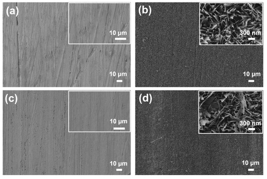 Scanning electron microscopy (SEM) images of copper surfaces at different modification stages: (a) Cu_Bare; (b) Cu_SHPL; (c) Cu_HPB; and (d) Cu_SHPB. Insets show high-magnification views of nanoscale features.