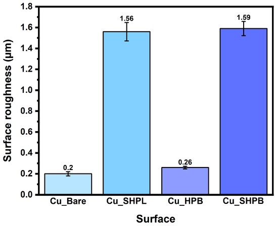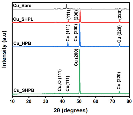 Figure 8 presents the XRD patterns for both uncoated and coated samples. The uncoated sample exhibits a peak at approximately 43.3°, which can be attributed to the (110) crystallographic plane of Cu (fcc), confirming the presence of the copper phase. However, all three coated samples display distinct Bragg reflections at 2θ values 43.4°, 50.4°, and 74.1°, which correspond to the crystallographic planes (111), (200), and (220) of the cubic structure of Cu (ICDD card no. 04-0836). For Cu_SHPB, less intense diffraction peaks are observed at 2θ values of 35.5° and 38.7°, which are associated with the planes (−111) and (111), respectively, revealing the presence of monoclinic CuO [22]. Each diffraction peak corresponding to the identified phases (Cu and CuO) is individually labeled in Figure 8 for clarity. The XRD analysis demonstrates the successful deposition of crystalline Cu with a strong (200) texture on the coated samples, while also revealing the formation of minor monoclinic CuO phase in the Cu_SHPL and Cu_SHPB. The clear distinction between the diffraction patterns of the uncoated and coated samples highlights the effectiveness of the coating process in modifying the surface phase composition and influencing the crystallographic orientation.