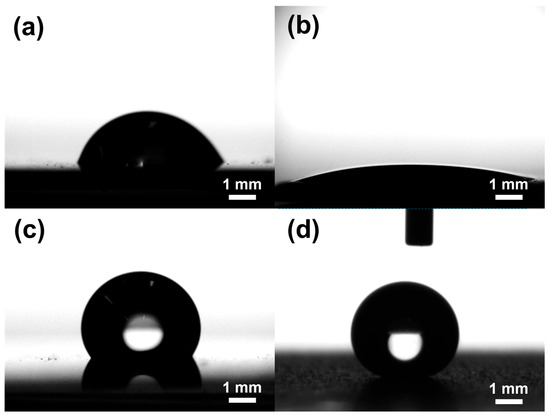 Static water contact angle images for (a) Cu_Bare, (b) Cu_SHPL, (c) Cu_HPB, and (d) Cu_SHPB.