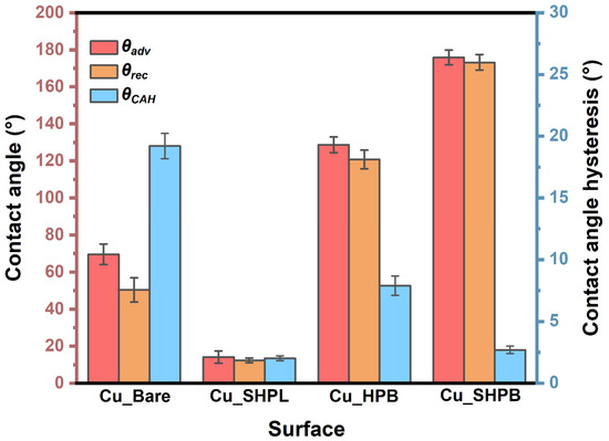 Contact angle and contact angle hysteresis measurements for all modified copper samples.