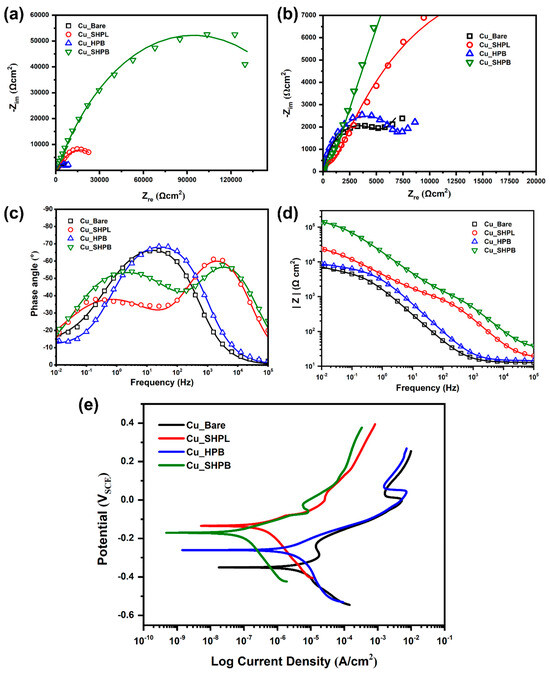 Electrochemical characterization of copper surfaces at different modification stages: (a) Nyquist plots from EIS showing impedance responses; (b) enlarged Nyquist plots highlighting low-impedance regions; (c) Bode phase angle plots illustrating phase response across frequencies; (d) Bode magnitude plots comparing impedance magnitude; and (e) potentiodynamic polarization curves demonstrating differences in corrosion potential and current density.