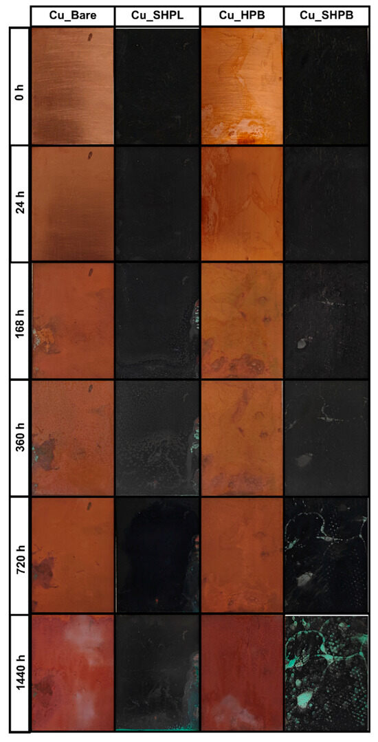 The most robust performance was demonstrated by the Cu_SHPB, which remained largely unchanged except for minor white stains in the early stages and only developed isolated green corrosion spots after extended exposure, with minimal spread even after 1440 h. This outcome underscores the synergistic effect of combining hierarchical surface roughness with chemical functionalization, as this integrated approach effectively delayed the onset and restricted the progression of corrosion, providing superior long-term protection for copper surfaces in aggressive saline environments [28].