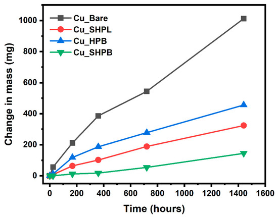 Figure 10 provides a clear visual representation of the corrosion progression observed on copper surfaces with different surface treatments during prolonged salt spray exposure, highlighting the distinct protective mechanisms and failure points associated with each modification. The Cu_Bare sample developed green corrosion products within 168 h, which progressively transformed into a widespread reddish-brown oxide layer, ultimately covering the entire surface and indicating severe, unchecked corrosion. In contrast, the Cu_SHPL initially exhibited localized green and white stains, but these diminished over time as a stable oxide layer formed, resulting in a relatively unchanged, darkened appearance that suggests the development of a passivating barrier limiting further corrosion. The Cu_HPB showed reddish-brown stains after 168 h, with gradual but contained discoloration, reflecting that the hydrophobic coating slowed but did not fully prevent oxidation. Gravimetric salt spray testing revealed substantial differences in the change in mass among the variously modified copper surfaces, as shown in Figure 11. After 1440 h of exposure, the bare copper exhibited the highest corrosion rate at 2.51 mm/year, consistent with its susceptibility to chloride-induced degradation in saline environments. In contrast, the nanostructured surface (Cu_SHPL) and the silane-coated surface (Cu_HPB) showed significantly reduced corrosion rates of 0.80 mm/year and 1.13 mm/year, respectively. The most pronounced protection was observed for the combined nanostructured and silane-coated surface (Cu_SHPB), which demonstrated a corrosion rate of only 0.36 mm/year.