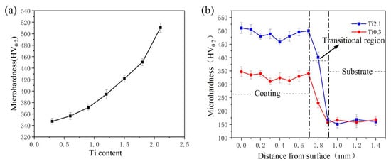 Hardness distribution of alloy coating: (a) surface hardness of Ti0.3-Ti2.1 samples, (b) hardness distribution across Ti0.3, Ti2.1 coatings, and base material.