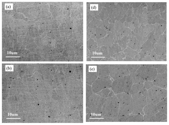 To analyze the elemental distribution at grain boundaries and their surrounding regions, line scanning was performed across the grain boundaries (The green arrow indicates the direction of the line scan), as shown in Figure 5. Figure 5a,b reveal that Nb is enriched at the grain boundaries of the coating, while Fe and Cr are relatively depleted. With increasing Ti content, as shown in Figure 5c,d, Ti gradually diffuses toward the grain boundaries, and the concentration of Nb at the grain boundaries also slightly increases. This is because titanium is typically more chemically active than niobium and tends to preferentially occupy vacancy sites under high-temperature conditions, thereby altering the local chemical environment within the material. In addition, the atomic radius and chemical properties of Nb and Ti are similar, and the increase in Ti will reduce the solubility of Nb in the matrix and promote the segregation of Nb to grain boundaries [19].