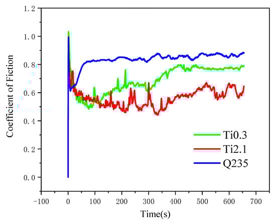 Figure 6 illustrates the curves of the friction coefficients of alloy coatings with varying Ti contents as they change over time. The friction coefficient of Ti0.3 is notably higher than that of Ti2.1. At the start of the wear test, the friction coefficient initially decreases due to the formation of a friction film between the sample surface and the friction pair, which reduces shear resistance. As time progresses, the contact area between the friction pair and the sample increases, and the coefficient of friction gradually increases and then tends to stabilize.