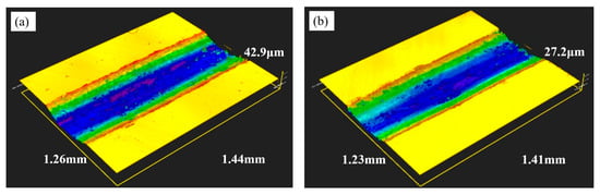 Based on the relationship between the material friction coefficient and wear resistance, the friction coefficient and weight loss of Ti2.1 are the lowest. This may be because an increase in Ti content can lead to grain boundary pinning and the formation of new compounds during rapid cooling, enhancing wear resistance [20]. Additionally, the introduction of Ti elements leads to a gradual shift towards a single BCC phase structure, improving hardness and wear resistance. The two-dimensional and three-dimensional wear morphology of the surfaces of the two coatings at room temperature are shown in Figure 7 (The change in color indicates depth differences). The coating surface developed unevenly deep grooves along the direction of friction. The Ti2.1 alloy coating exhibited the best wear resistance, with the smallest wear depth over the same distance range. The formula for calculating the wear rate of the coating is W = Vloss/(FN·H), where W represents the wear rate, Vloss is the volume of wear, FN is the load, and H is the total sliding distance. Table 3 shows the wear rate of the Ti0.3 and Ti2.1 coatings as well as Q235 under a load of 20 N.