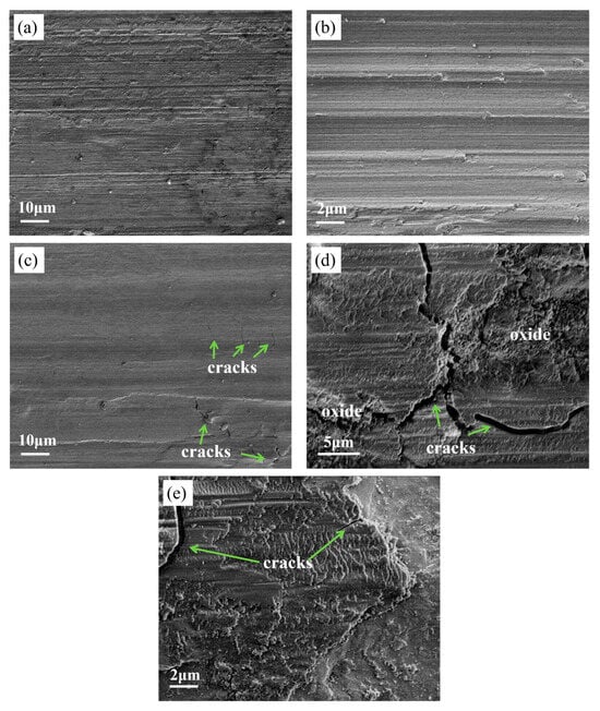 Figure 8 shows the microstructure after wear when the load is 20 N. Figure 8a,c show the microstructure of the Ti0.3 and Ti2.1 samples after wear. As can be seen from Figure 8a, there is no obvious crack on the surface of the T0.3 coating after wear, and micro-cutting occurs on the surface, showing a ploughing groove morphology, indicating that the wear mechanism of the T0.3 coating belongs to the typical abrasive wear. As can be seen from Figure 8b, over time, the coating peels off more severely, and more abrasive particles are produced. The microstructure of Ti2.1 after wear was analyzed, and it was found that some microcracks and spalling marks caused by brittle fracture appeared. The higher hardness of Ti2.1 leads to stress concentration and toughness deficiencies during wear, resulting in cracks. Additionally, Figure 8d reveals that the worn T2.1 coating surface displays a porous oxidized microstructure, indicating oxidation-induced degradation. This observation confirms the occurrence of oxidative wear on the T2.1 coating. Such oxidative wear is further substantiated by the EDS mapping data presented in Figure 9. Notably, visible cracks observed on the worn surface in Figure 8e demonstrate fatigue wear resulting from cyclic contact stresses, and the morphology of layered exfoliation is presented. Thus, the T2.1 coating exhibits a composite wear mechanism dominated by fatigue wear accompanied by significant oxidative wear.