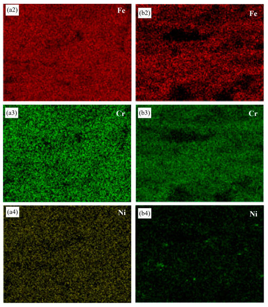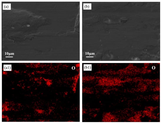 Figure 9 illustrates the elemental distribution after wear at a 20 N load on both coatings. It can be observed that the distribution of elements in the coating is relatively uniform, and oxygen elements exist in all of them and are locally covered on the surface of the grinding mark. This is attributed to the heat generated in the reciprocating friction process, and the oxidation layer formed during wear is attached to the worn surface, resulting in oxidative wear in some areas. This conclusion can also be confirmed by the data reflected in SEM images in Figure 8c,d. Comparing Figure 9(a1,b1), it is evident that the oxidative wear is more pronounced in the T2.1 coating than in the T0.3 coating. This phenomenon is primarily attributable to the higher content of the BCC phase in the T2.1 coating microstructure. The enhanced BCC phase fraction strengthened the coating hardness, thereby rendering the coating more resistant to being plowed through during wear testing. Consequently, this led to localized temperature elevation, which promoted thermal oxidation.