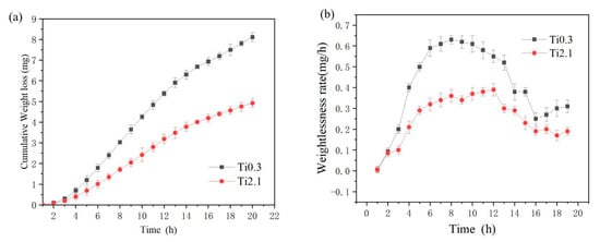 Weight loss curve of laser cladding alloy coating under cavitation erosion with time: (a) weight loss at different times, (b) weight loss rate at different times.