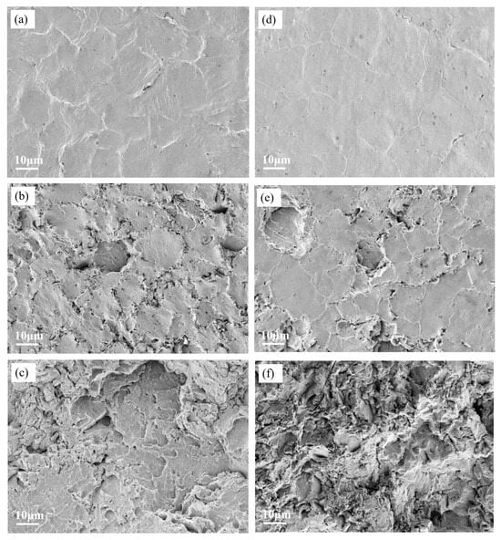 Figure 11 presents the post-cavitation microstructures of the coatings. From the figure, the cavitation erosion (CE) process can be observed. After 1.5 h of CE exposure, both coatings exhibited plastic deformation without surface spalling, indicating that both were in the CE incubation period. Among them, the T0.3 coating showed significantly more pronounced plastic deformation than the T2.1 coating. After 4 h of CE, spalling occurred on both coatings, suggesting that they entered the CE acceleration stage. Notably, the grain boundaries of T0.3 experienced more severe spalling compared to T2.1. This also reveals that the grain boundary strength of T2.1 is higher than that of T0.3. After 20 h of CE, both coatings underwent complete surface spalling. The T0.3 coating surface displayed quasi-cleavage fracture characteristics—a mixed-mode fracture morphology comprising cleavage facets, dimples, and tear ridges. The T2.1 coating also exhibited mixed-mode fracture features, with transgranular fracture, dimple rupture, and fatigue fracture accompanied by secondary cracks coexisting.