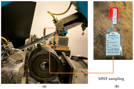(a) Industrial band saw PILOUS ARG 300 Plus H.F. used in the experiment (PILOUS s.r.o., Brno, Czech Republic); (b) MWF sampling.