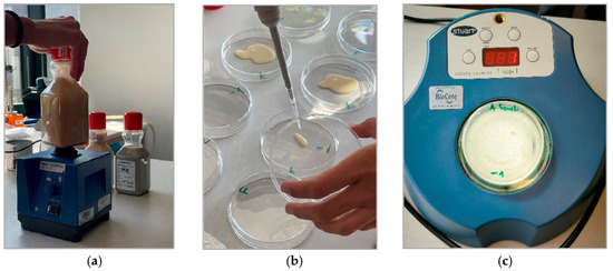 The logical sequence of individual steps and the complete methodology for determining culturable microorganisms is illustrated in detail in Figure 2a–c. The procedure was carried out in accordance with the ČSN EN ISO 6222 standard [43]. After homogenization, the sample exhibited a pH of 8.9. Complete mixing was achieved after 2 min of vortex stirring, as confirmed by visual inspection and the homogeneous dispersion of particles throughout the sample.
