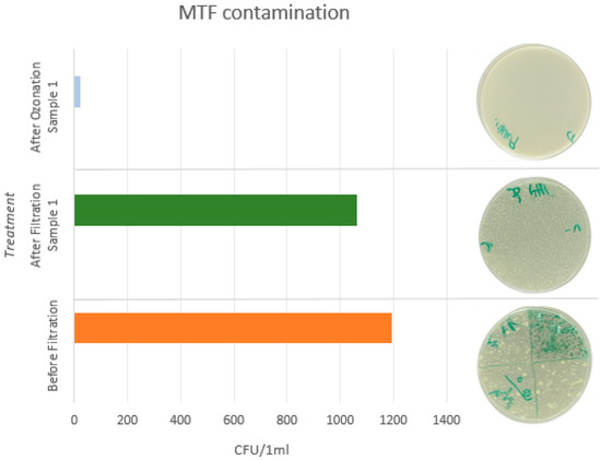 Ozonation represents a promising physical method for the decontamination of MWFs, and its application in this study demonstrated a substantial microbiological effect. A marked reduction in microbial load was observed after 30 min of ozone treatment, with colony-forming units (CFU) decreasing from initial concentrations of approximately 1300 CFU/mL to 25–29 CFU/mL, as presented in Table 5 and Table 6. This corresponds to a reduction in microbial load exceeding 95%. In contrast, filtration alone resulted in only a marginal decrease in CFU counts (e.g., from 1304 to 1296 CFU/mL), underscoring the superior efficacy of ozonation in microbial reduction.