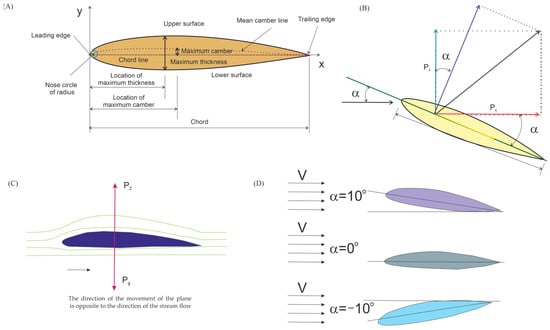 The figure below (Figure 1) shows the key aerodynamic parameters and phenomena characterizing the aircraft, where the following are presented: main parameters characterizing the airfoil geometry (A); aerodynamic forces acting on the airfoil (B); the post-airflow around the wing airfoil (C); and angle of attack of the wing (D) [39,40].