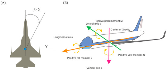 The measurements in the tunnel can be made not only for the variable angle of attack , but also depending on the sideslip angle ; in this work, the tests were limited to a constant sideslip angle. This angle is between the velocity vector and the plane of symmetry of the airplane (Figure 2A) [44]. A sideslip angle other than zero causes asymmetric flow around the plane, resulting in a lateral force () acting on the plane.