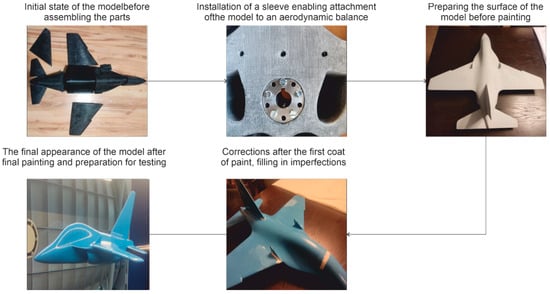 Based on the above, particularly the research problem and questions, as well as existing theoretical knowledge supported by a critical analysis of the literature, a research hypothesis was formulated assuming that appropriate surface treatment techniques would significantly improve the accuracy of the representation of key aerodynamic parameters of the test object. The main aim of the research was to confirm this hypothesis based on conducting a series of detailed experimental tests. To achieve this aim, a detailed plan was developed based on the 3D printing technique of a model of the M-346 Master military supersonic aircraft and its precision surface treatment.