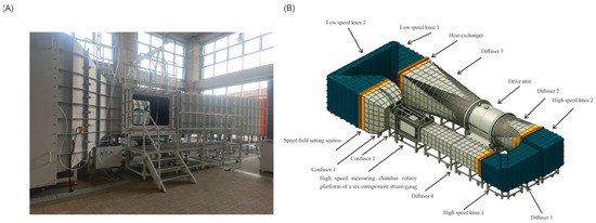Figure 4 shows a diagram of the test stand with a description of its individual elements. The structure of the tunnel has been designed in such a way that it is possible to change its configuration by changing the segments. It is possible to use a low and high-speed measuring chamber. A high-speed chamber was used during the tests [54].