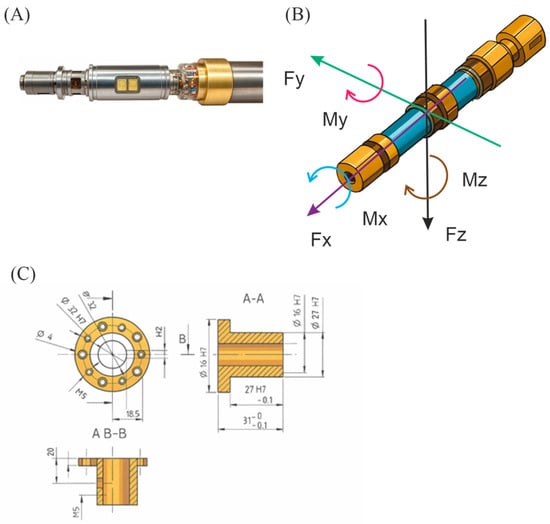 Measurements of forces and moments in this tunnel are carried out automatically using the FMT 618-1b transducer, which is a “bending beam” transducer. It is made of duplex 17-4 steel with a hardness of approx. 40 HRC [54] (Figure 5A).