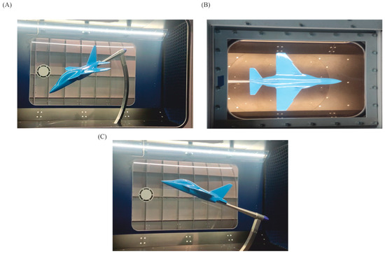 Aircraft model using post-processing technology: during the test at and (A); top view of the aircraft model in the measurement chamber (B); during measurement at 20 m/s (C).