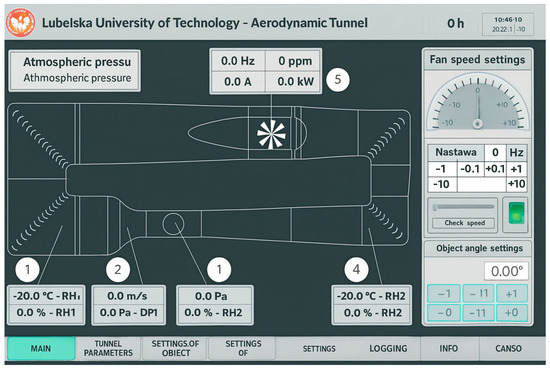 Before each measurement session begins, a “dynamic tare” reference measurement is performed for a predetermined grid of measurement points. This measurement allows to determine the influence of forces (mainly gravity) and moments on the model without aerodynamic loading. The signals measured in this way are automatically subtracted from the values obtained during measurements with the aerodynamic loading of the model. Photographs illustrating the model during measurement are shown in Figure 6B,C. The flow velocity in the wind tunnel is set from the operator’s panel (Figure 7) and controlled automatically [54].