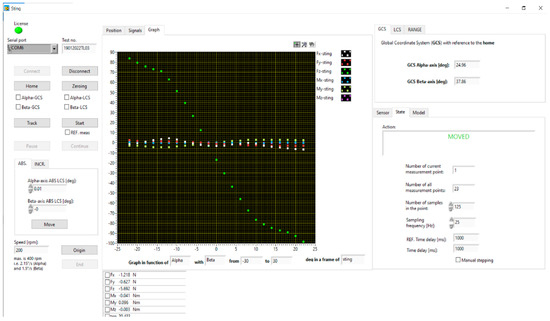 The measurement of forces and moments is carried out using the Sting software, version 2.244.5, which controls the measurement and records the measurement data. The measurement results are displayed in the program in the form of a graph. A file with compiled measurement data for further analysis is saved on the computer’s hard drive. The Sting screenshot is shown in Figure 8 [54].