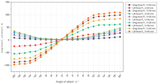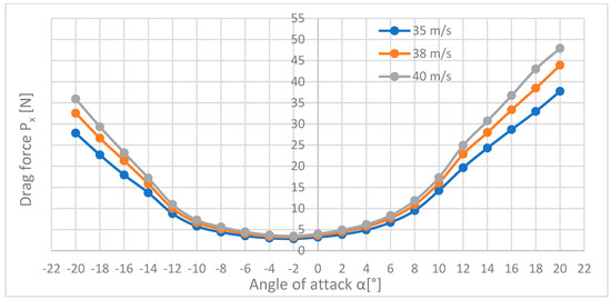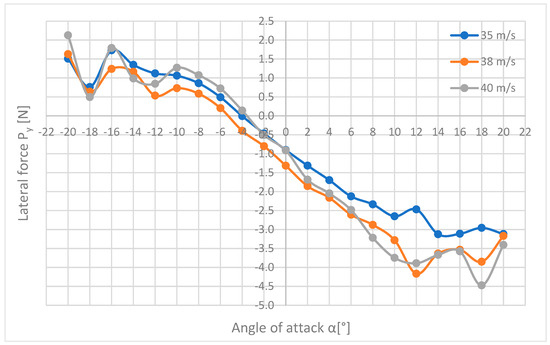 In the course of the paper, six key quantities affecting the aircraft during flight were measured in the form of forces, i.e., drag force (), lateral force (), and lift force (), as well as pitching (), roll (), and yawing () moments. All parameters were analysed, but only at the three highest flow velocities, i.e., 35, 38, and 40 m/s, summary plots (Figure 19, Figure 20 and Figure 21) were created so that an in-depth analysis of the results was possible once the results had been systematized.