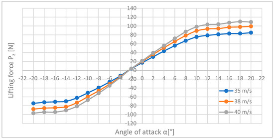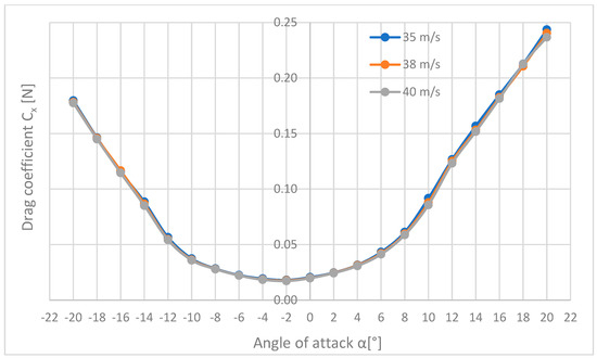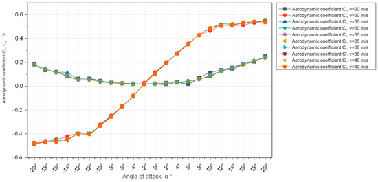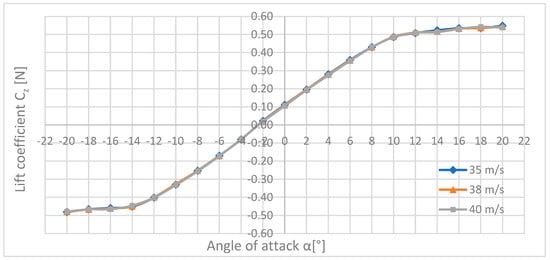 Referring to the analysis of the results obtained, it should be emphasized that the tests were performed correctly and the results were probable and consistent with the expectations and reference standards, which is confirmed, for example, by collective graphs of force coefficients, the drag force and lift force , and respectively, i.e., and (Figure 9 and Figure 10), where the curves for all speeds overlap. The overlapping of the curves on the graph also proves the high measurement accuracy of the aerodynamic balance used.