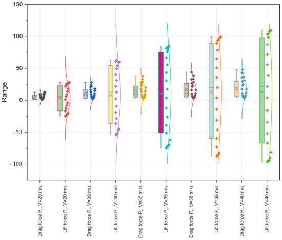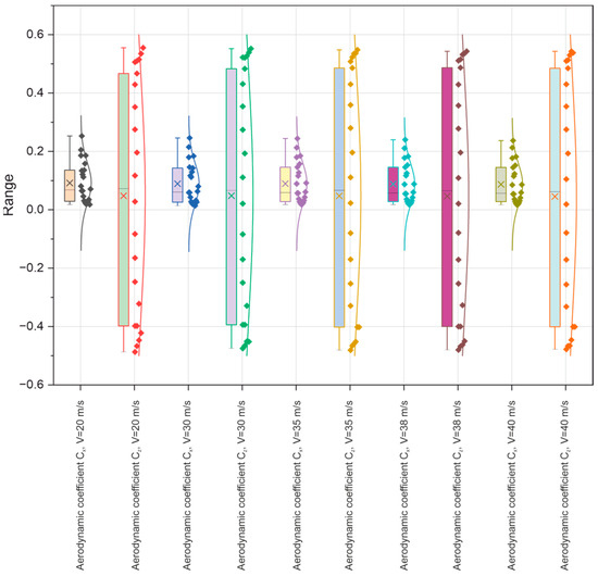 Tests were carried out for five flow velocities, i.e., 20, 30, 35, 38, and 40 m/s, for a range of angles of attack from −20° to +20°. The results obtained are presented in tabular and graphical form, as well as based on the statistical analysis performed using box plots for the forces (, ) and dimensionless aerodynamic coefficients (, ) of the tested model illustrated in Figure 20 and Figure 21, respectively.