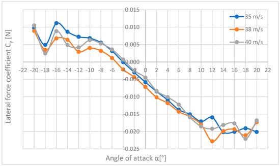 Figure 17 shows how the coefficients of the lateral force acting on the plane change and what low values are during the tests. For angles of attack from −20° to +10°, the graphs have a similar shape, while for angles from +10° and above, there are significant discrepancies. The smallest values of the lateral force coefficient occur for the angle of attack = 4° and are almost equal to 0. The largest coefficient of lateral force is 0.023 and corresponds to the same point as the maximum lateral force, i.e., = +12°, and the flow velocity V = 38 m/s.