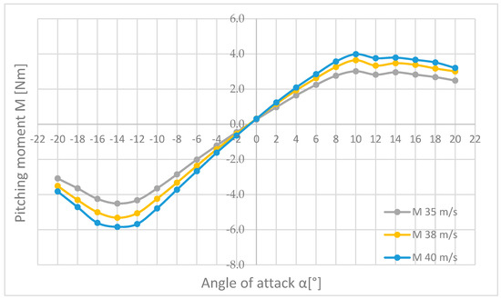 In Figure 19 it can be seen that the pitch moment diagrams for all speeds have a very similar shape and differ only in the values depending on the angle of attack and the speed of the air stream in the wind tunnel. The pitch moment is zero at an angle of attack equal to about −1°, and as the nose of the aircraft moves upward, it increases until it reaches the angle of attack = +10° and then begins to decrease until the end of the measurement. In the case of negative angles, it is similar; the moment increases in the opposite direction until reaching the angle of attack = −14° and begins to decrease significantly, much faster than in the case of positive angles. The maximum pitch moment is 3.99 Nm for a flow velocity of 40 m/s and an angle of attack = +10°.