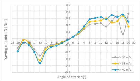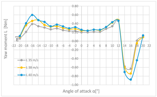 Analyzing the graph in Figure 20, it can be seen that the waveforms of the roll moment have a similar shape; slight discrepancies occur in a narrow range of angles of attack from −16° to −10°. In the extreme position, where the nose of the plane is down, the moment if it is close to zero and increases to −16°, then slightly decreases until reaching the angle of attack equal to +6°, where the upward trend begins again. After exceeding the angle of attack equal to +12°, there is a sudden change in the direction of operation and an increase in the roll moment; at +16°, it reaches the maximum value equal to (in the case of a flow velocity of 40 m/s) 0.88 Nm. Then the torque decreases, and for speeds of 35 and 38 m/s, it approaches zero at an angle of attack of +18°, and at an angle of +20°, it is clearly visible that regardless of the flow velocity, the roll moment has similar values.