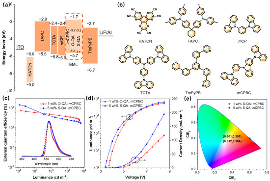 - Jin, Z.; Wu, C.; Tong, K.N.; Shi, K.; Jung, S.; Li, S.; Wang, X.; Li, Z.; He, W.; Ye, M.; et al. Boosting Electroluminescence Efficiency Based on TADF Emitters Featuring Multiple Resonance Segment Integrated with a Co-Host Exciplex. Mater. Today Energy 2025, 49, 101833. [Google Scholar] [CrossRef]