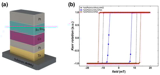 (a) Schematic of thin-film structure. (b) P-MOKE measurement for Pt(3)/Co(1)/Pt(5) and same multilayer with Ru and RuO2 as non-magnetic spacer.