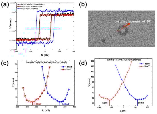 (a) The magnetic hysteresis loop of the thin film. (b) The measurement of DW velocity using domain wall displacement. (c,d) Domain wall velocity versus Bx (the in-plane field) for (c) Ta(3)/Pt(3)/Co(1)/RuO2(1)/Pt(3) and (d) Ta(3)/Pt(3)/Co(1)/Ru(1)/Pt(3).