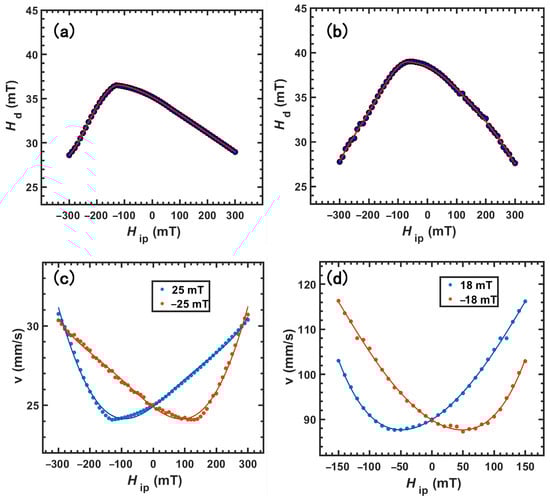 Thus, although an in-plane field cannot drive a DW directly in a PMA film, it can still modulate the velocity by rotating the wall’s magnetisation. With both HOP and HIP applied, the magnitude and sign of HDMI can be extracted by identifying the HIP value that yields the velocity minimum at a fixed out-of-plane field. The relevant HIP-v curves from the simulated HIP–Hd relations were derived. By correlating the experimentally observed v(HOP) with the calculated Hd values, we derived accurate v0 and Td. The computed velocities nearly align with the experimental data, and the positions of the minima correspond well with theoretical predictions. As can be seen in Figure 4a,b, the graphs are clearly asymmetric about HIP = 0, and the degree of asymmetry increases with the magnitude of D. This asymmetry is intrinsic to interfacial DMI systems. The DMI selects a chiral Néel wall with internal magnetisation; HIP parallel (antiparallel) to this internal magnetisation lowers (raises) the wall’s energy and the elastic stiffness, thereby reducing (increasing) the depinning field, Hd, and the creep barrier. The velocity minimum occurs near HIP ≈ −HDMI, where the wall becomes Bloch-like and its energy is maximised.
