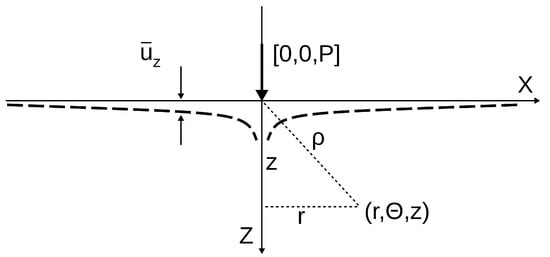 In order to determine the relationship between the force acting on the indenter and its displacement, it is convenient to consider first the reaction of the elastic medium filling the half-space () to the action of a point force acting on its boundary [12] (Figure 2). Then, using the principle of superposition, the result can be generalized to a continuous distribution of point forces.