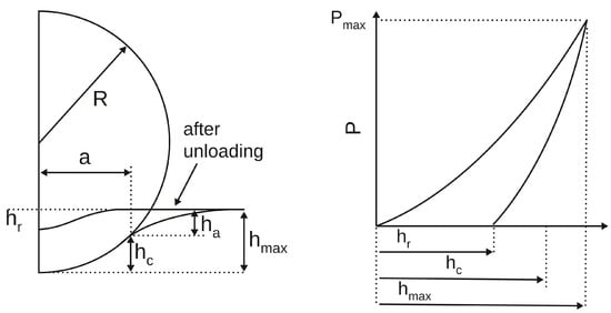 where is the contact area. Indeed, the Oliver–Pharr method [14] is based on an equation of a form similar to (14) and allows, by analyzing the unloaded part of the curve, to determine the reduced Young’s modulus also in the case when indentation is accompanied by plastic deformation. The method can be simply explained in the case of the spherical indentation and comes down to estimating the contact depth and then the contact area . Assuming that the initial small segment of the unloading part of the curve reflects the elastic behavior of the material, one can imagine an equivalent elastic indentation passing through the points of that segment. Then, a short analysis based on Equations (12) and (13) leads to the following result: