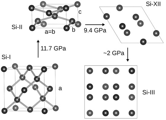 - Hu, J.Z.; Merkle, L.D.; Menoni, C.S.; Spain, I.L. Crystal data for high-pressure phases of silicon. Phys. Rev. B 1986, 34, 4679–4684. [Google Scholar] [CrossRef]