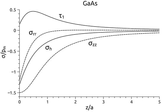 Stress distribution and along the indentation axis for GaAs. Maximum compressive stress occurs at the point of contact between the surface and the indenter (). The maximum shear (Tresca) stress reaches its extreme value at a certain distance from the indenter ().