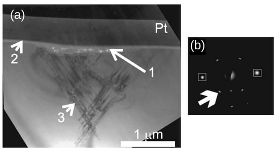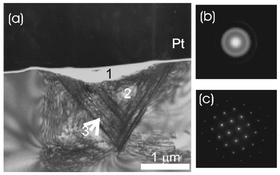 Similar conclusions were posted in the works [57,58,59], where nanoindentation experiments were supplemented with structural investigations (the transmission electron microscopy (TEM), the Raman spectroscopy) of the silicon crystal after unloading. For example, the article by Bradby et al. [57] describes nanoindentation experiments performed on the (001) surface of a Si crystal with a spherical indenter (radius of 4.5 m). Application of a maximum load of 20 mN produced a complex microstructure in the vicinity of the residual impression (Figure 7). The following were observed: (1) a thin amorphous Si layer directly under the indenter with small particles of the Si-XII crystal phase embedded in the amorphous one, and (2) slip bands indicating dislocation activity during plastic deformation. Application of a larger maximum load of 80 mN resulted (Figure 8) in the presence of an amorphous Si layer and slip bands located beneath it (region 3).
