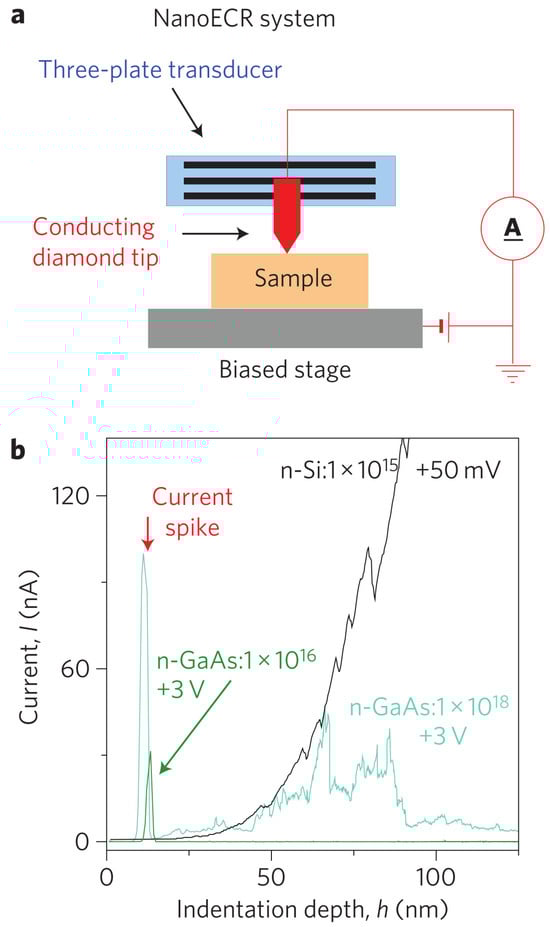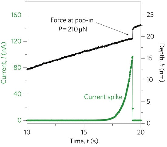 - Nowak, R.; Chrobak, D.; Nagao, S.; Vodnick, D.; Berg, M.; Tukiainen, A.; Pessa, M. An electric current spike linked to nanoscale plasticity. Nat. Nanotechnol. 2009, 4, 287–291. [Google Scholar] [CrossRef]