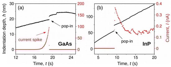 Due to the discrete nature of the plastic deformation, a smooth curve can exhibit discontinuities. When recorded during the loading stage–load-controlled regime: P applied, h measured—the discontinuity (pop-in) signals a sudden displacement of the indenter into the crystal at a very narrow interval of load. During operation in the displacement-controlled mode (h applied, P measured), the occurrence of pop-in is equivalent to reducing the force sensed by the indenter at a very narrow displacement range. Usually, the first pop-in event indicates the beginning of the nanoindentation-induced plastic deformation [26].