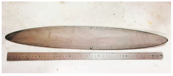A 20 kg lightweight steel ingot was prepared by vacuum induction melting. The chemical composition of the steel obtained by chemical analysis is Fe-28.6Mn-10.2Al-1.1C-3.2Ni-3.9Cr (wt.%). The density measured through the Archimedes method was 6.6 g·cm−3. The ingot was homogenized at 1200 °C for 4 h. The hot- and cold-rolling processes were conducted on a two-roll mill (with a maximum strip width of 400 mm). A 30 mm thick block was cut from the ingot and then hot-rolled at a starting temperature of 1100 °C to produce an 8 mm thick plate. The hot-rolled plate was subsequently solid-solution-treated at 900~1100 °C for 1 h. Then the plate was cold-rolled to a final thickness of 2 mm with a total reduction rate of 80%. The real photograph of the cold-rolled sheet is shown in Figure 1. The cold-rolled sheet was annealed at 900 °C for different times and immediately quenched in water. For convenience, the sample solution treated at 1100 °C is referred to as ST1100, and the samples annealed at 900 °C for 3 min and 15 min are referred to as A900-3 and A900-15, respectively.