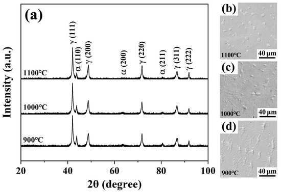 (a) XRD patterns and (b–d) SEM micrographs of the steel after solid solution treatment at 1100 °C, 1000 °C, and 900 °C for 1 h.