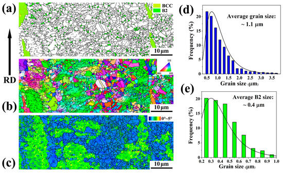 EBSD characterization and analysis of A900-3 sample. (a) Phase map; (b) IPF map; (c) KAM map; (d) distribution of austenite grain size; (e) distribution of B2 particle size.