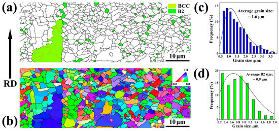 Tensile samples, with a length, width, and thickness of 55 mm, 5 mm, and 2 mm, respectively, were cut along the rolling direction. Tensile tests were conducted at a strain rate of 10−3 s−1 using a CMT4105 electronic universal testing machine (Sansi Testing Instrument Ltd., Shenzhen, China). The volume fraction of recrystallization and the average size of recrystallized grains were calculated by EBSD. The volume fraction and the average size of B2 particles at grain boundaries and within the austenite matrix were determined by EBSD and SEM micrographs.