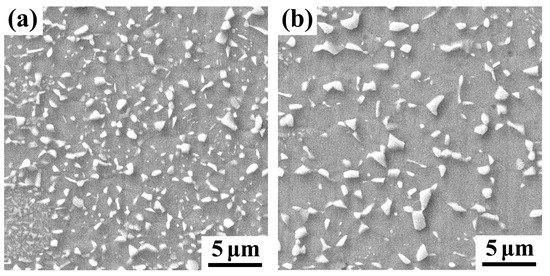 Figure 5a displays the SEM microstructure of the A900-3 sample. It can be observed from the micrograph that the B2 precipitated particles are relatively small. Most of the particles are sub-micron in size, indicating that the precipitated phases did not fully grow within the short annealing time. A relatively large number of precipitated phases are dispersed throughout the austenite matrix. Figure 5b shows the SEM microstructure of the A900-15 sample, where the B2 precipitated particles grew significantly. Some particles approach or exceed 1 μm in size, demonstrating that the longer annealing time allowed sufficient time for precipitate aggregation and coarsening. The number of precipitated phases decreased, and their distribution became relatively sparse. This is because as the particles grew, some small particles merged into large ones, resulting in a reduction in the number. Particle size measurements from the images show that in the A900-3 sample, the B2 precipitates have an average equivalent diameter of 0.3~0.5 μm, while in the A900-15 sample, the average size increases to 0.8~1.2 μm. The short annealing time limits atomic diffusion distances, resulting in smaller particles, whereas the extended annealing provides adequate energy for the aggregation and growth of B2 precipitates through atomic diffusion, leading to a significant increase in particle size.