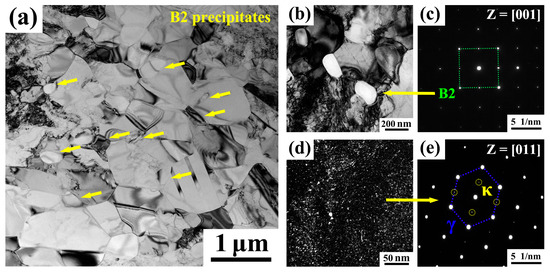 TEM microstructural morphology of A900-3 sample. (a) Bright-field image showing the recrystallized austenite grain and B2 precipitates (as marked by yellow arrows). (b,c) Bright-field image and corresponding SAED pattern of B2 particles. (d,e) Dark-field image and corresponding SAED pattern of κ-carbides.